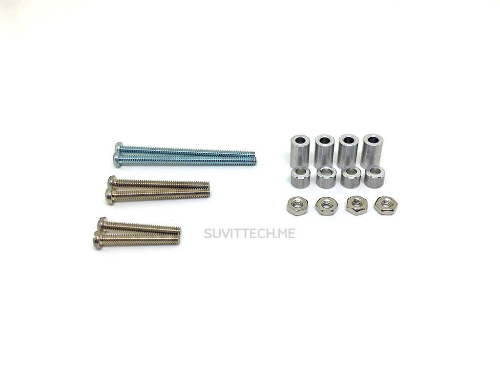 รีวิวชุดสกรูเริ่มต้น Mini 4WD Screw Set A (#15232) ประกอบไปด้วย สกรูเหล็ก (Screw) 2 มิลลิเมตร (M2) ความยาว 15, 20 และ 30 มิลลิเมตร อย่างละ 2 ชิ้น นัทเหล็ก (Nut) 4 ชิ้น ท่อสกรูอะลูมิเนียม (Aluminum Spacer) ความสูง 3 และ 6.7 มิลลิเมตร อย่างละ 4 ชิ้น